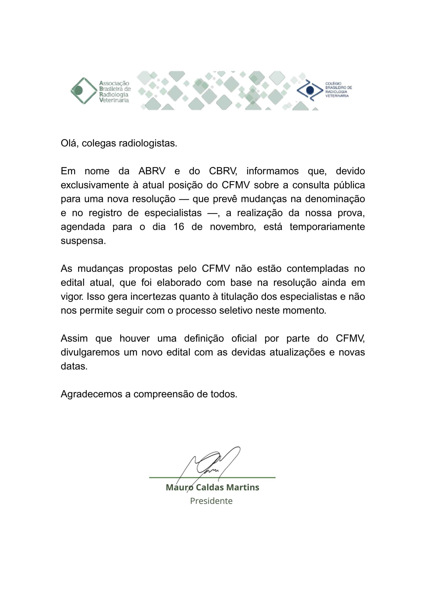 A ABRV – Associação Brasileira de Radiologia Veterinária é responsável pela elaboração e aplicação da prova de título de especialista em diagnóstico por imagem, conforme as Resoluções do Conselho Federal de Medicina Veterinária – CFMV de nº 935 de 18/02/2010, nº1.903 de 28/10/2015 e a Resolução nº 1253 de 6 de fevereiro de 2019, esta última que habilita a ABRV conceder o Título de Especialista em Diagnóstico por imagem Veterinária, em território nacional.